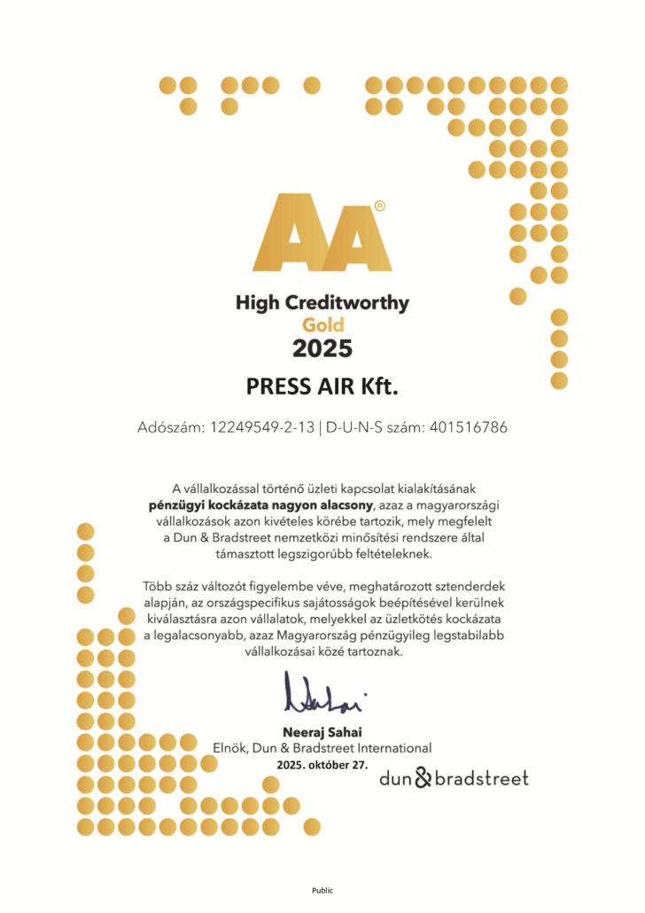 A D&B (2021-ig Bisnode) nemzetközi cégminősítő minden vállalkozás pénzügyi stabilitását, üzleti megbízhatóságát minősíti egy folyamatosan visszamért és bizonyított, nemzetközi szakértők által kialakított rendszer alapján. 2023-ban a megújult formátumú tanúsítások közül a Press Air Kft. a D&B A Gold tanúsítványát kapta meg, mellyel Magyarországon kevesen rendelkeznek, és azt jelzi, hogy velünk az üzleti kapcsolat kialakításának pénzügyi kockázata rendkívül alacsony.